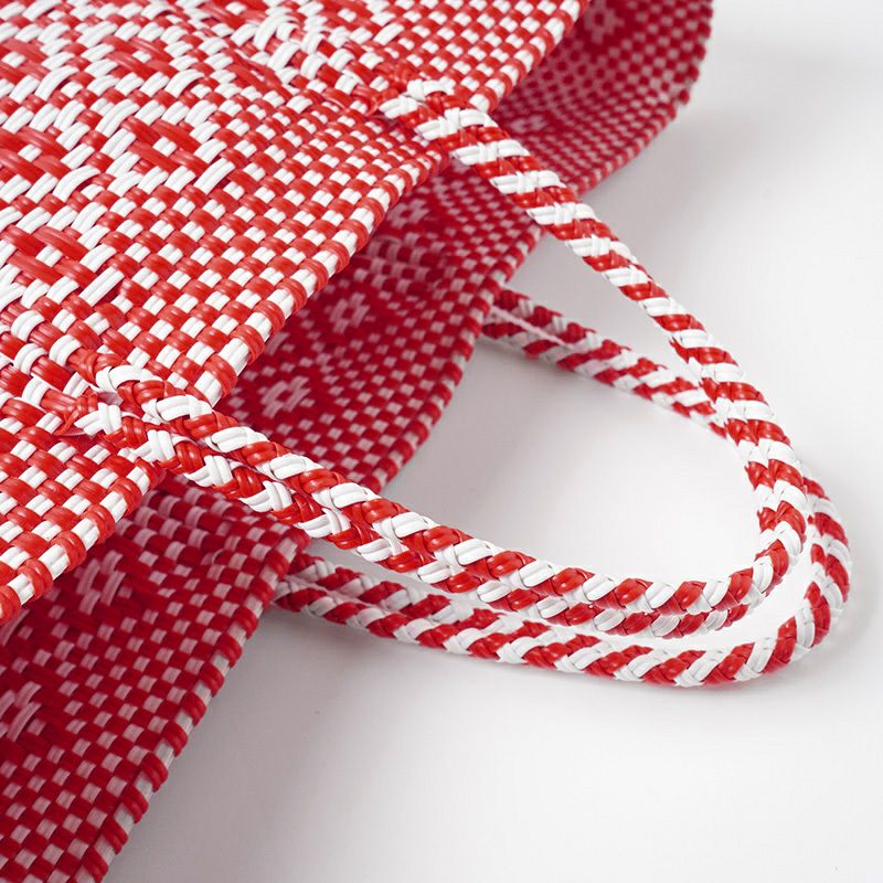 本体からハンドル部分にいたるまで紐がしっかりと編み込まれており、とても丈夫に作られているバッグは、水に濡れても平気な素材でできているため、水洗いも可能です。