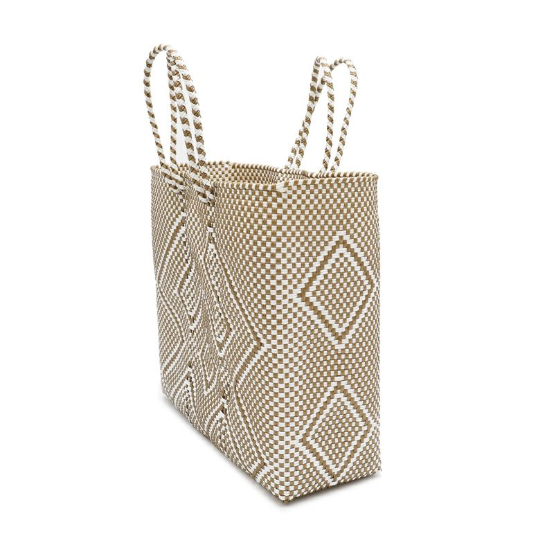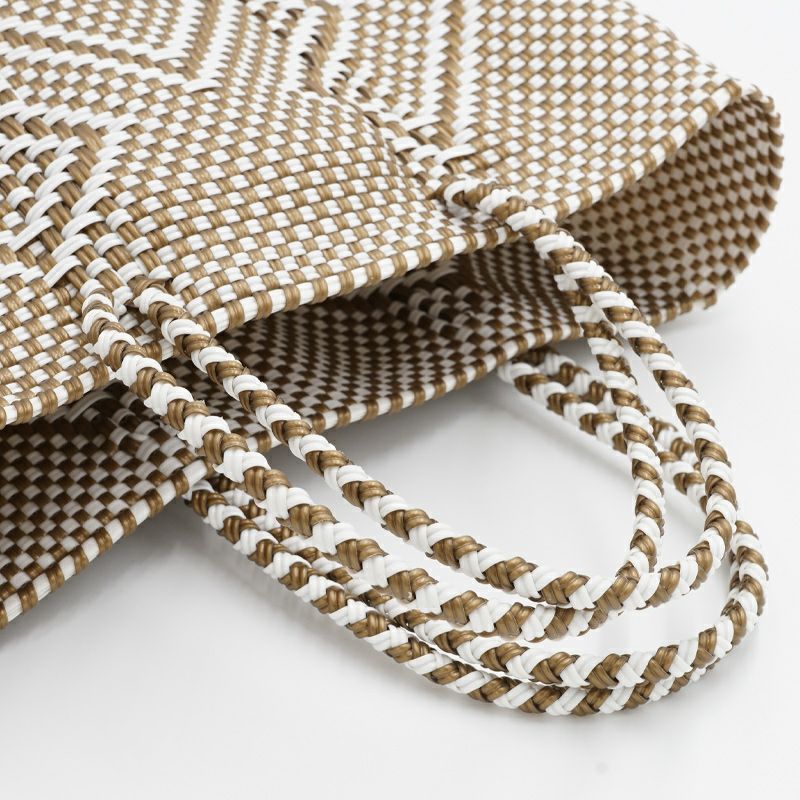 本体からハンドル部分にいたるまで紐がしっかりと編み込まれており、とても丈夫に作られているバッグは、水に濡れても平気な素材でできているため、水洗いも可能です。