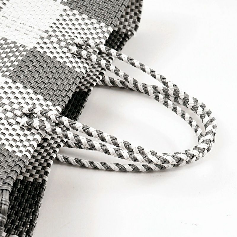 本体からハンドル部分にいたるまで紐がしっかりと編み込まれており、とても丈夫に作られているバッグは、水に濡れても平気な素材でできているため、水洗いも可能です。