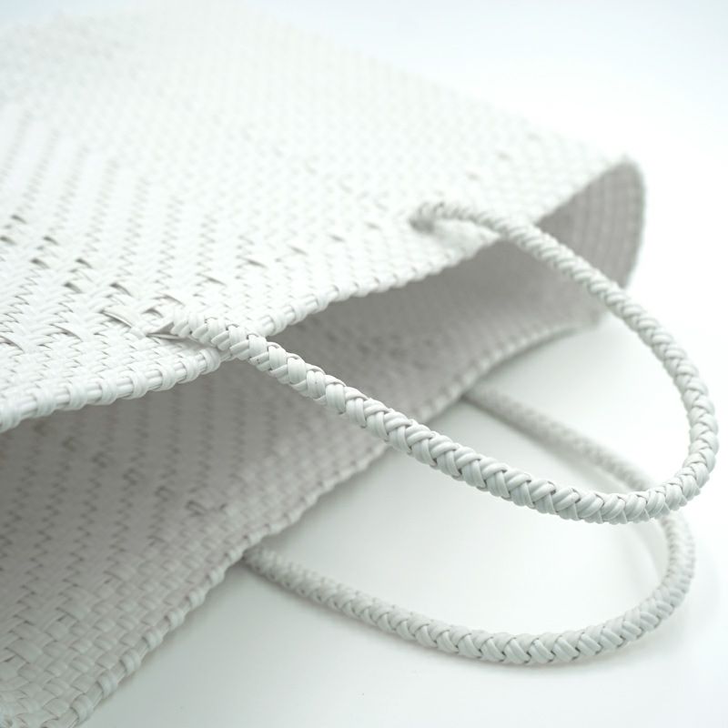 本体からハンドル部分にいたるまで紐がしっかりと編み込まれており、とても丈夫に作られているバッグは、水に濡れても平気な素材でできているため、水洗いも可能です。