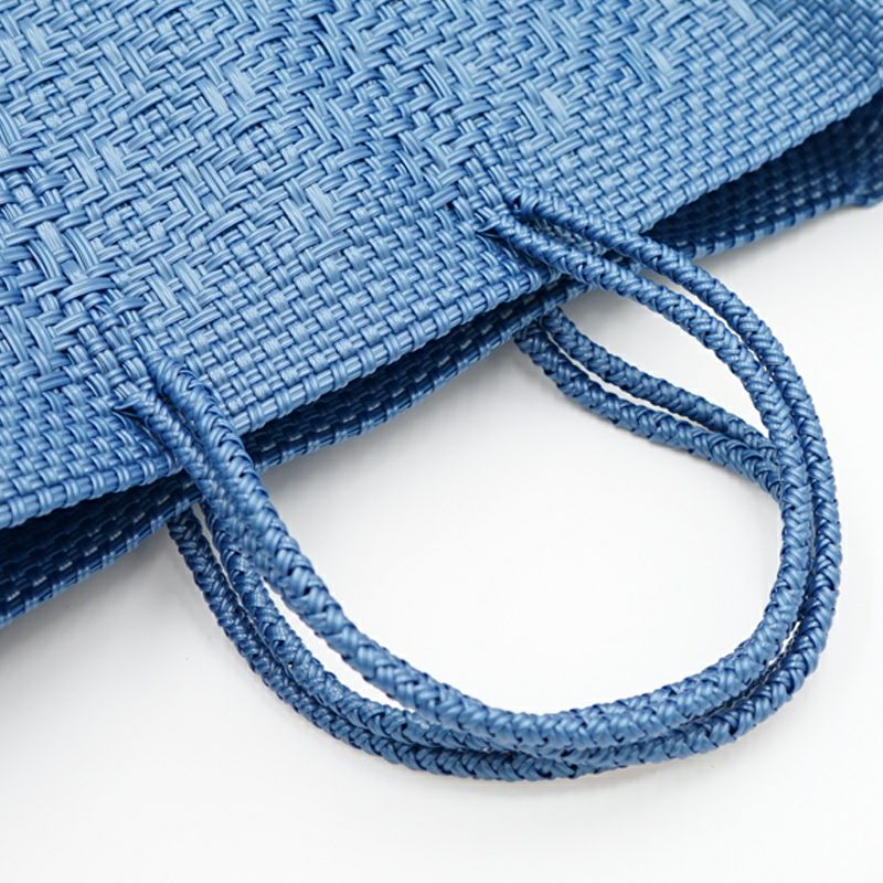 本体からハンドル部分にいたるまで紐がしっかりと編み込まれており、とても丈夫に作られているバッグは、水に濡れても平気な素材でできているため、水洗いも可能です。
