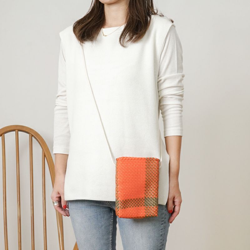 メルカドバッグのコードで編んだポーチにはシンプルショルダーを付けました。カジュアルに楽しめるバッグになっています。