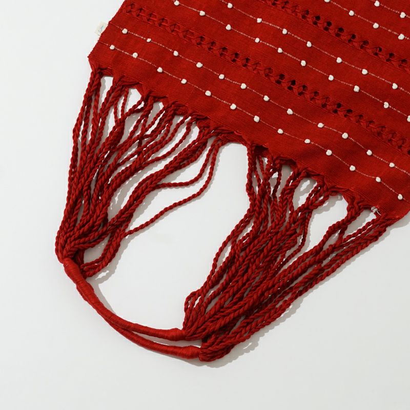 肩ひも部分は、バッグを織っていた糸を縒って作られており、糸処理の結び目が飛び出して見える場合がございます。