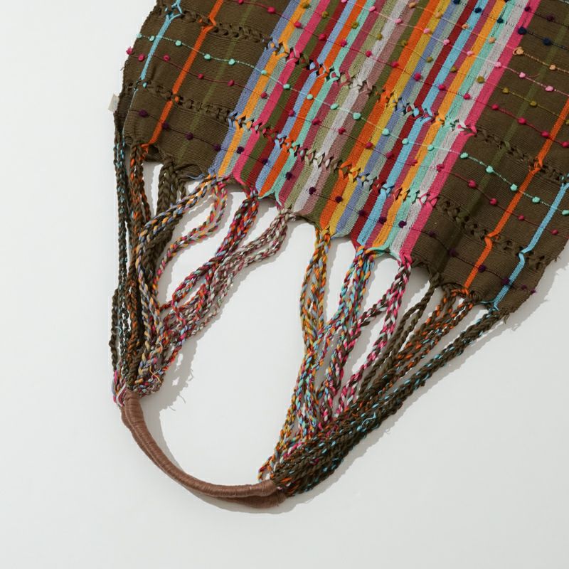 肩ひも部分は、バッグを織っていた糸を縒って作られており、糸処理の結び目が飛び出して見える場合がございます。