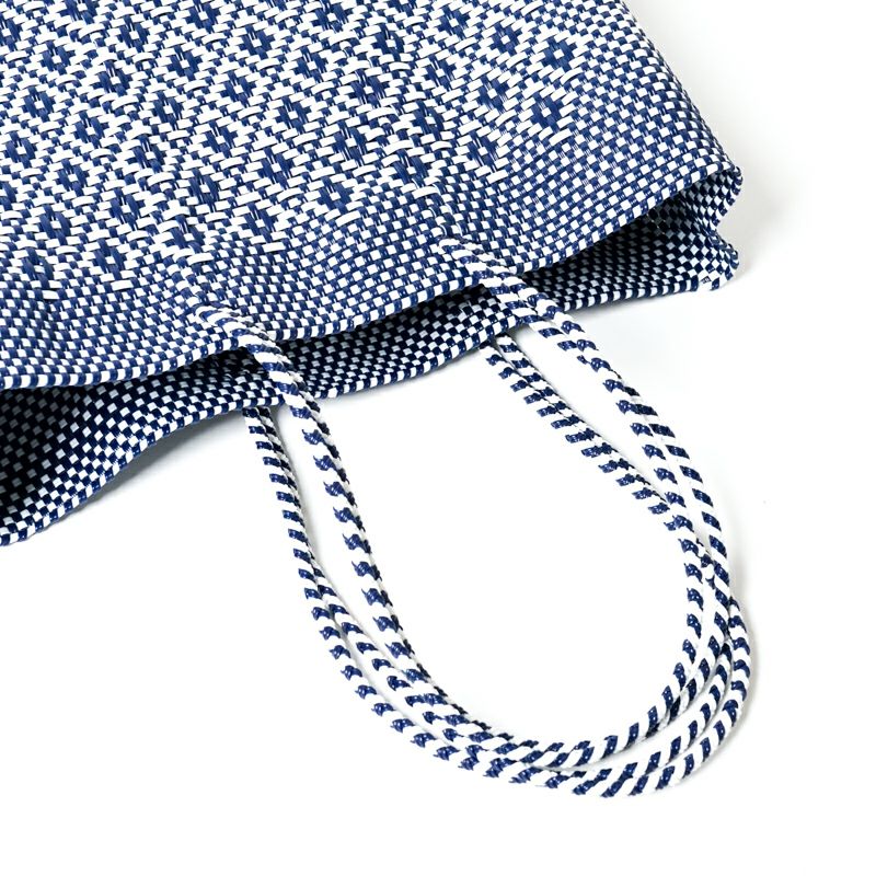 本体からハンドル部分にいたるまで紐がしっかりと編み込まれており、とても丈夫に作られているバッグは、水に濡れても平気な素材でできているため、水洗いも可能です。
