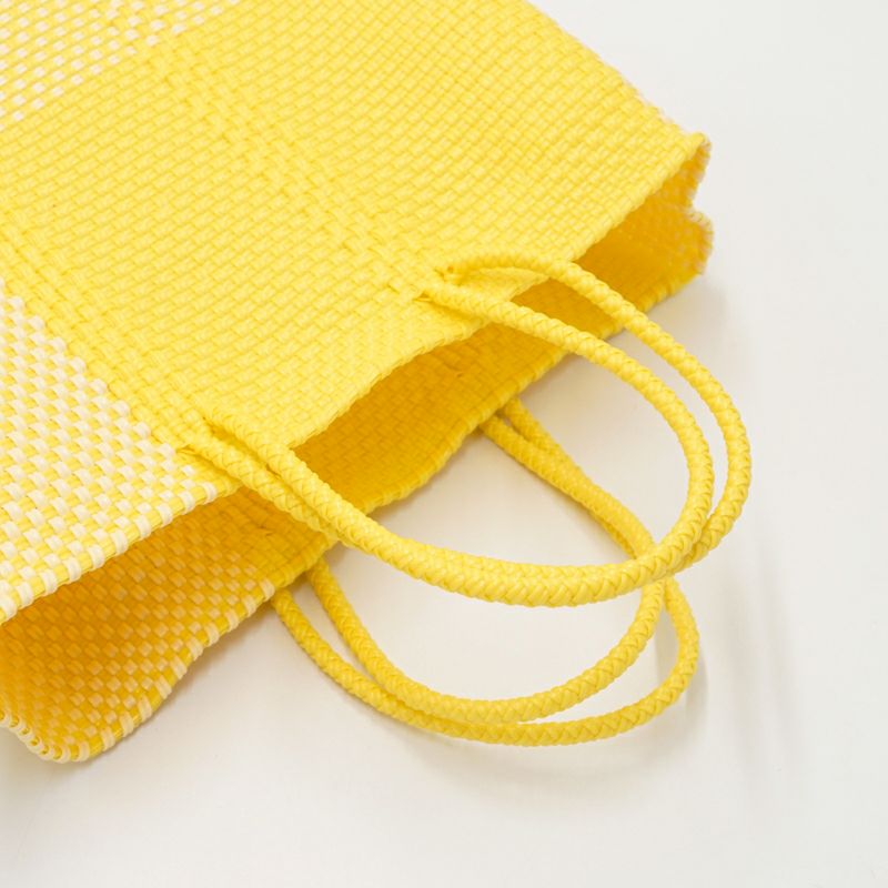 本体からハンドル部分にいたるまで紐がしっかりと編み込まれており、とても丈夫に作られているバッグは、水に濡れても平気な素材でできているため、水洗いも可能です。
