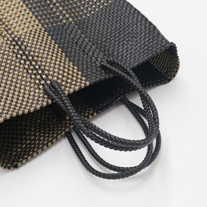 本体からハンドル部分にいたるまで紐がしっかりと編み込まれており、とても丈夫に作られているバッグは、水に濡れても平気な素材でできているため、水洗いも可能です。