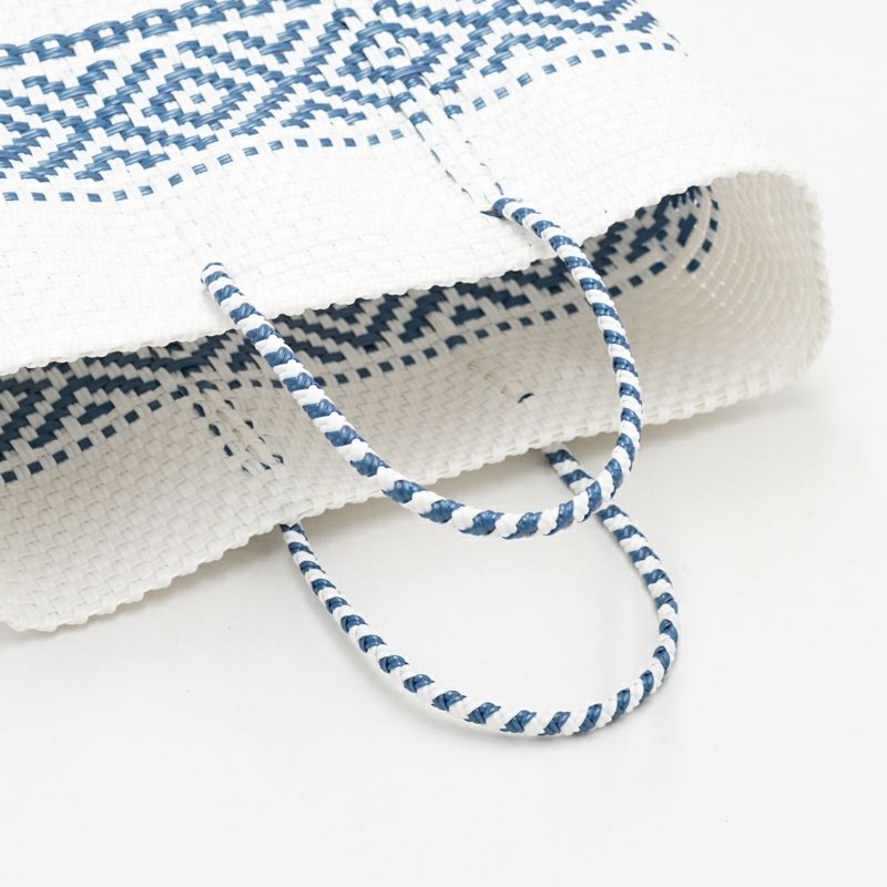 本体からハンドル部分にいたるまで紐がしっかりと編み込まれており、とても丈夫に作られているバッグは、水に濡れても平気な素材でできているため、水洗いも可能です。