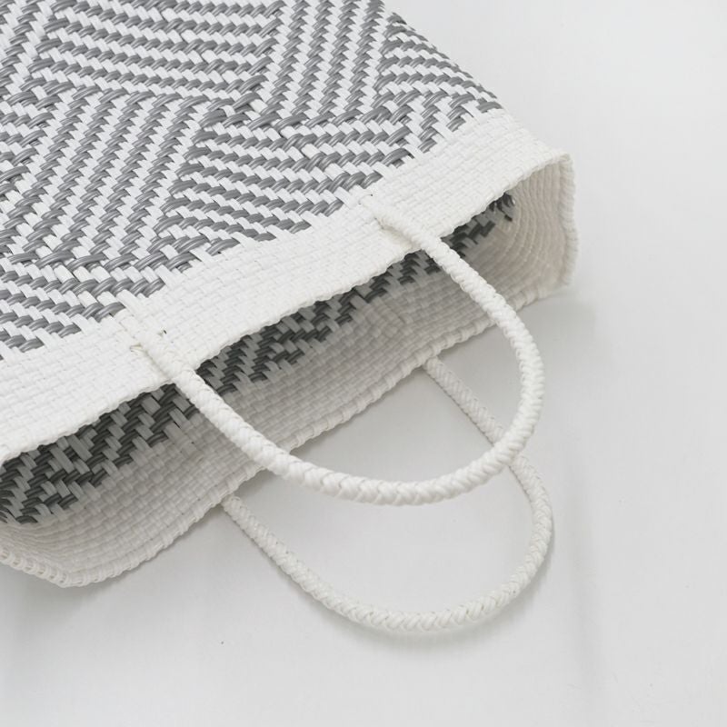 本体からハンドル部分にいたるまで紐がしっかりと編み込まれており、とても丈夫に作られているバッグは、水に濡れても平気な素材でできているため、水洗いも可能です。