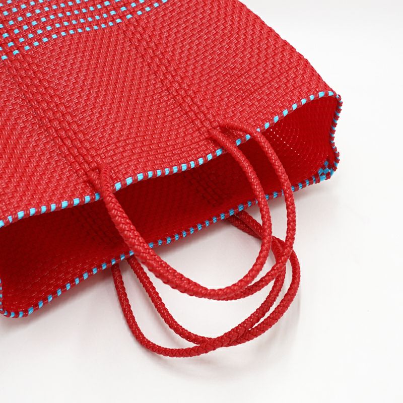 本体からハンドル部分にいたるまで紐がしっかりと編み込まれており、とても丈夫に作られているバッグは、水に濡れても平気な素材でできているため、水洗いも可能です。