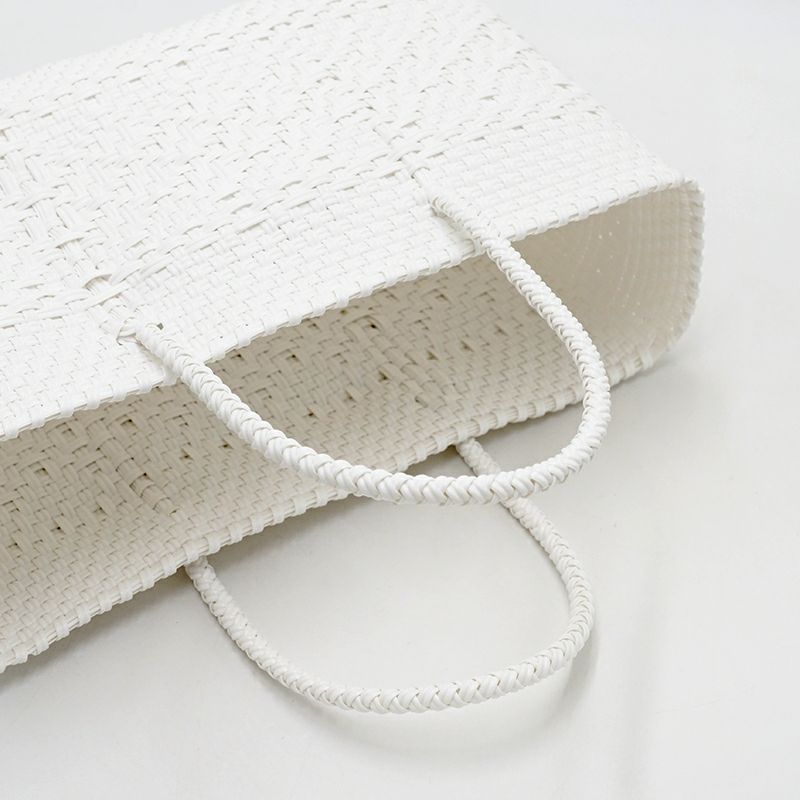 本体からハンドル部分にいたるまで紐がしっかりと編み込まれており、とても丈夫に作られているバッグは、水に濡れても平気な素材でできているため、水洗いも可能です。