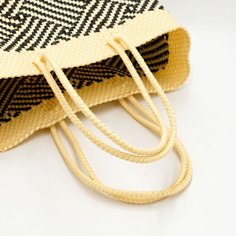 本体からハンドル部分にいたるまで紐がしっかりと編み込まれており、とても丈夫に作られているバッグは、水に濡れても平気な素材でできているため、水洗いも可能です。