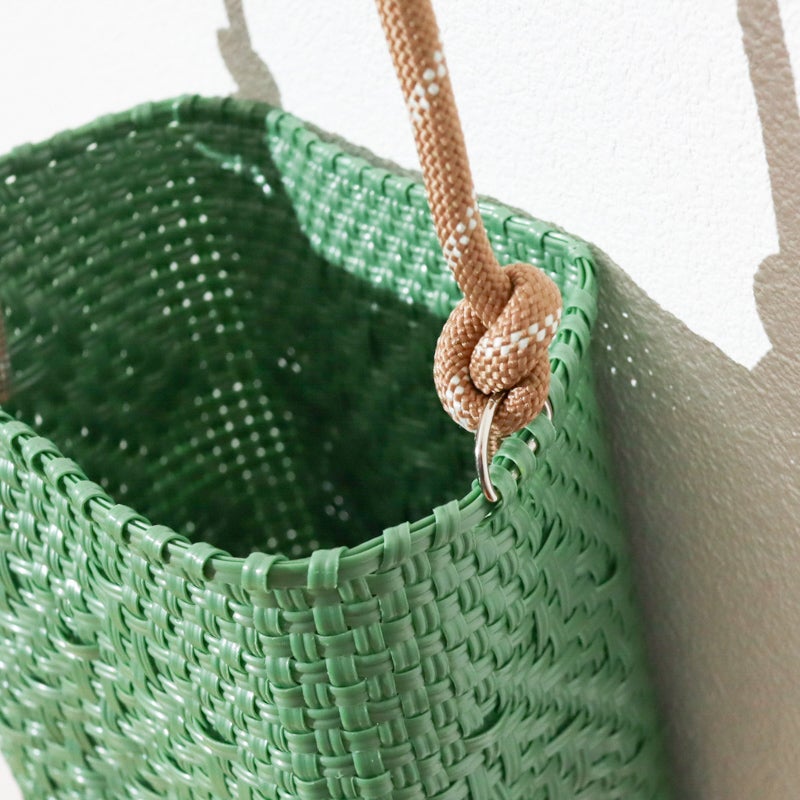 本体からハンドル部分にいたるまで紐がしっかりと編み込まれており、とても丈夫に作られているバッグは、水に濡れても平気な素材でできているため、水洗いも可能です。