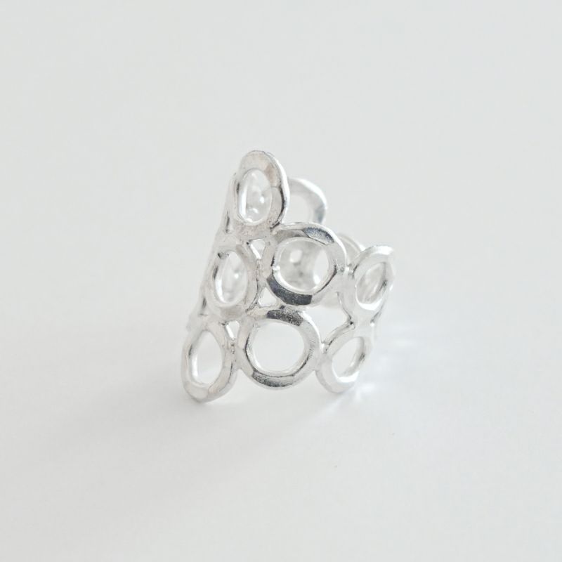 緩やかにカーブするリングに球体を組み合わせたリングは、
