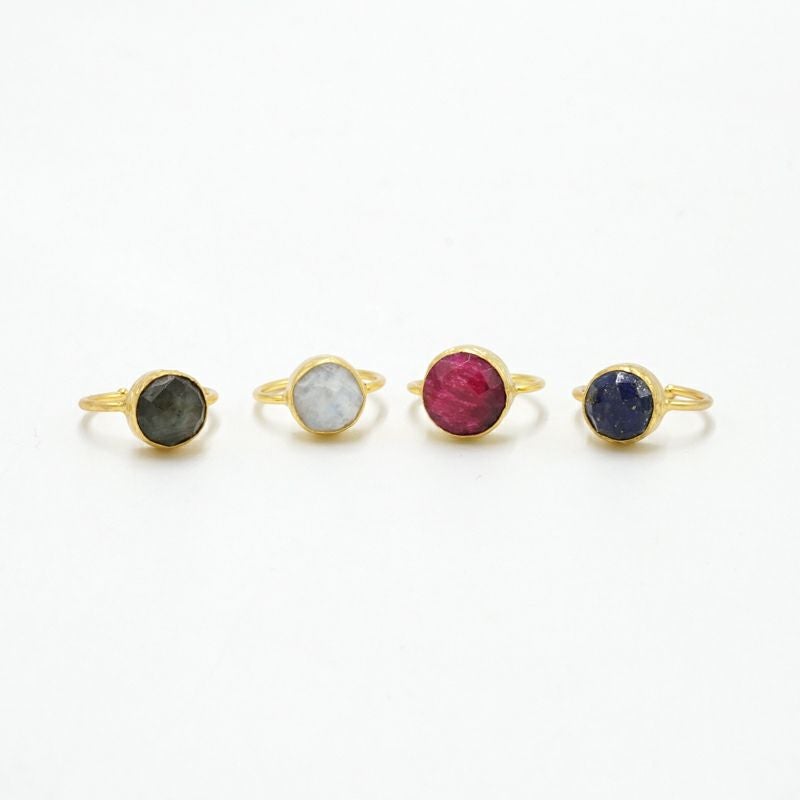 色とりどりの天然石は、台座の真鍮との相性も良く、どこかアンティークジュエリーのような雰囲気を纏っています。