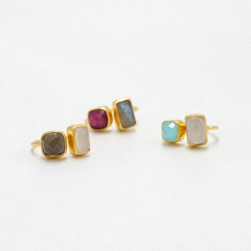 色とりどりの天然石は、台座の真鍮との相性も良く、どこかアンティークジュエリーのような雰囲気を纏っています。