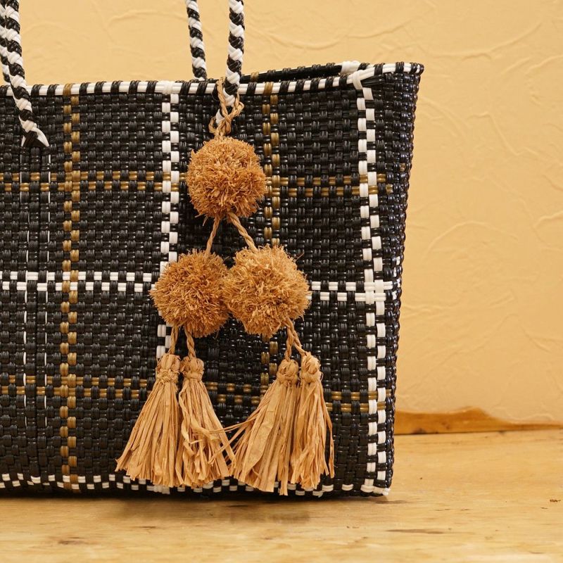 ラフィアの天然素材でできたタッセル付きのポンポンチャームです。