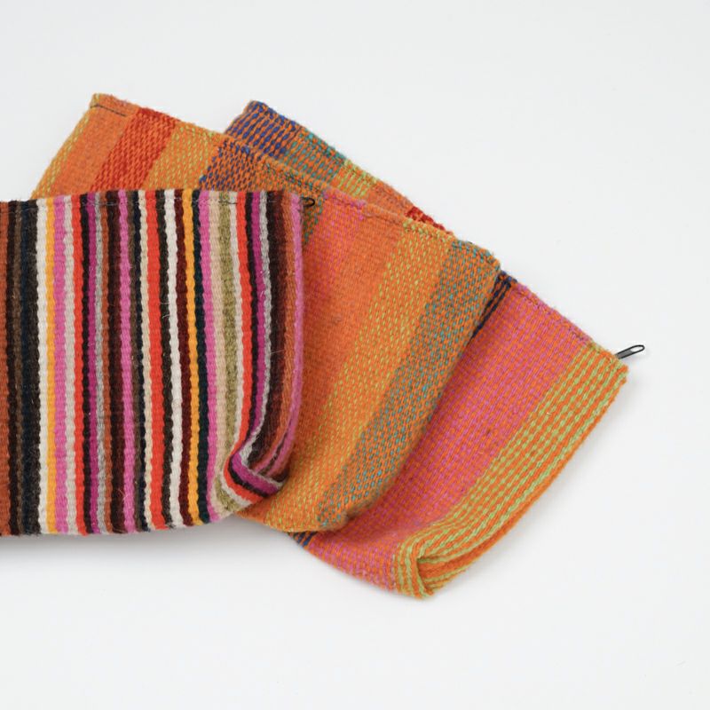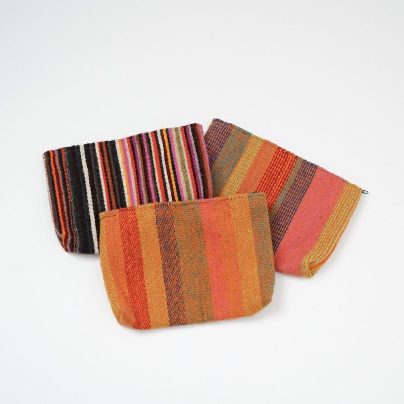 ラグのようなしっかりとした厚みのある生地は丈夫で、触るとあたたかみのあるポーチ。