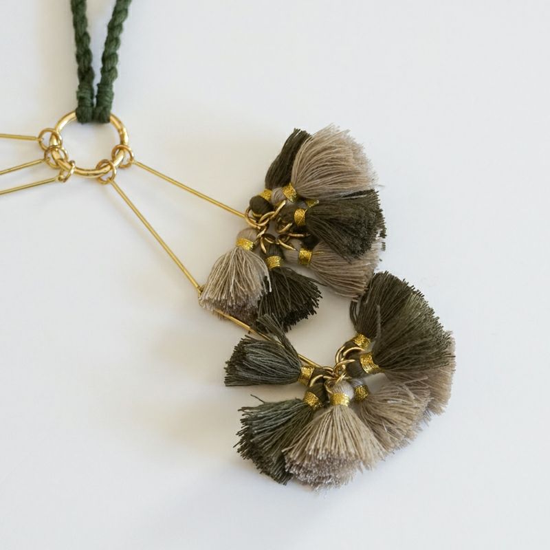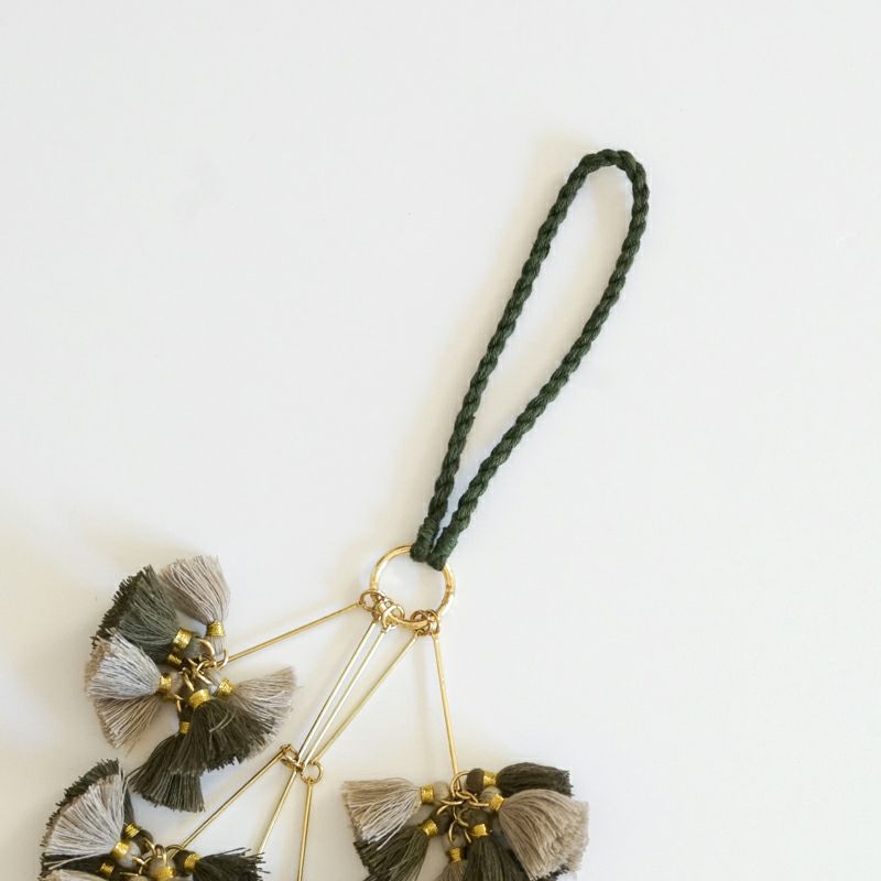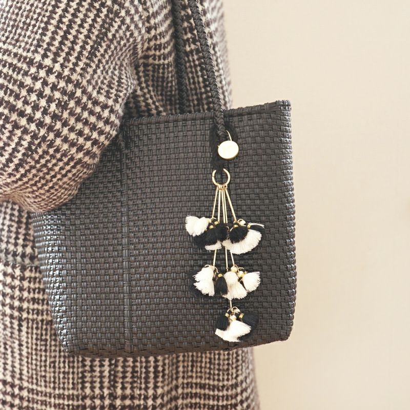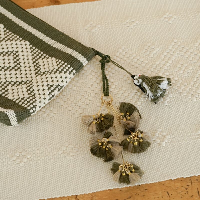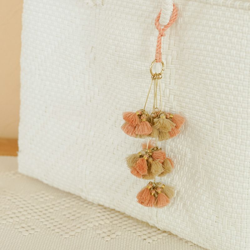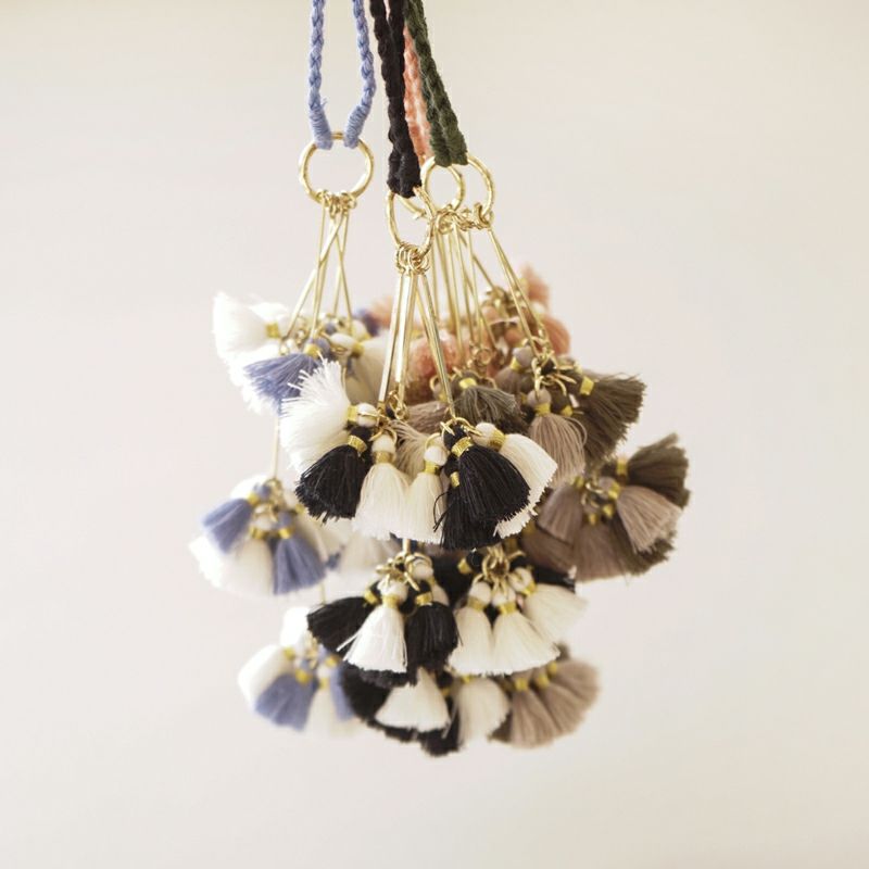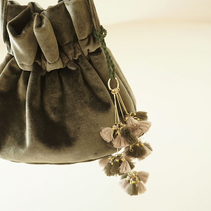 小さなタッセルとゴールドのパーツをふんだんに使ったチャームは華やかで、季節を問わずお使いいただけます。
