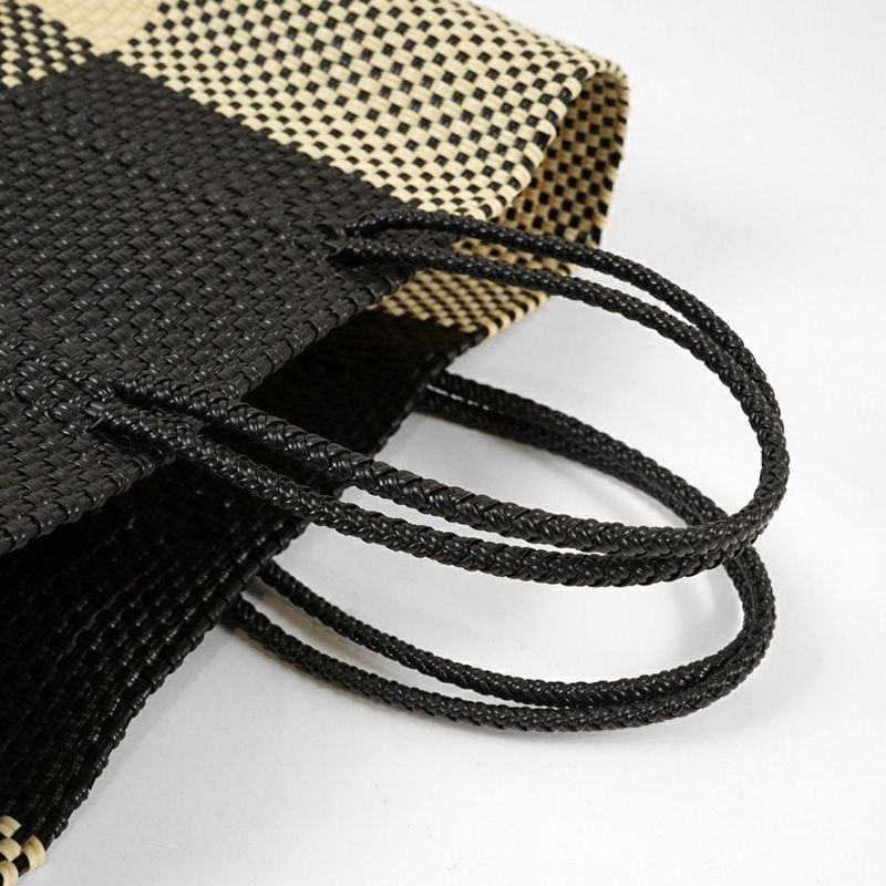 本体からハンドル部分にいたるまで紐がしっかりと編み込まれており、とても丈夫に作られているバッグは、水に濡れても平気な素材でできているため、水洗いも可能です。
