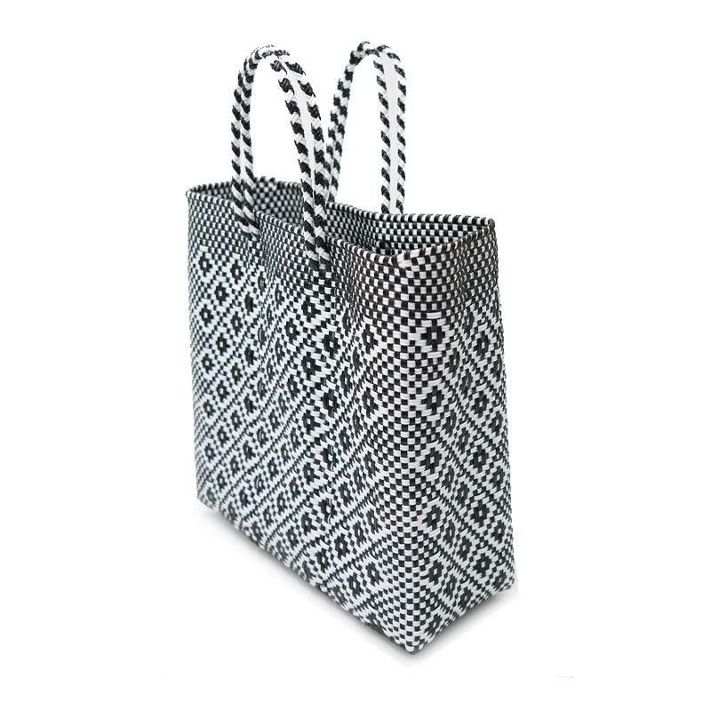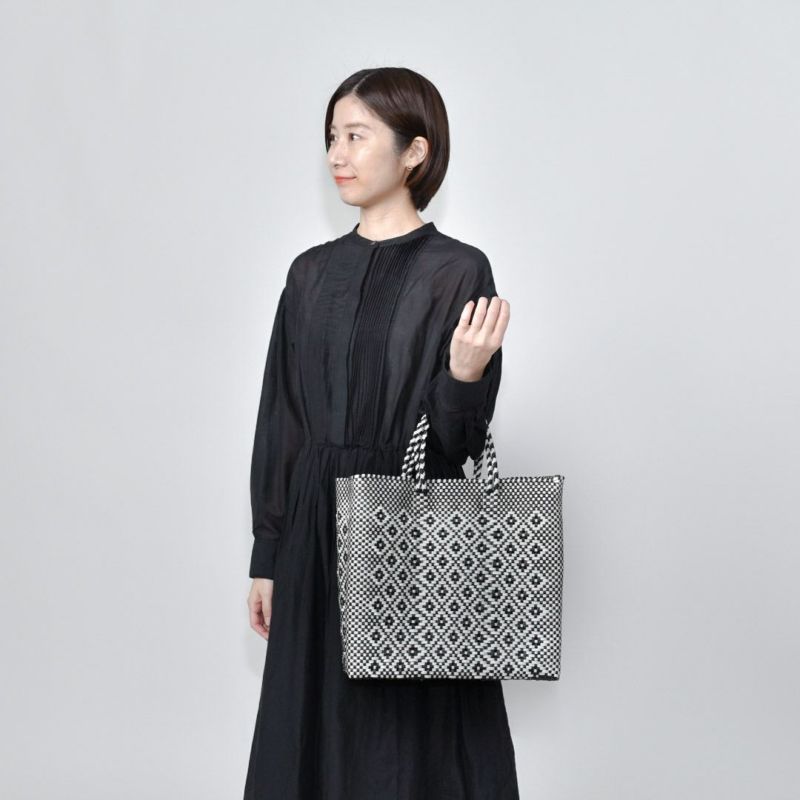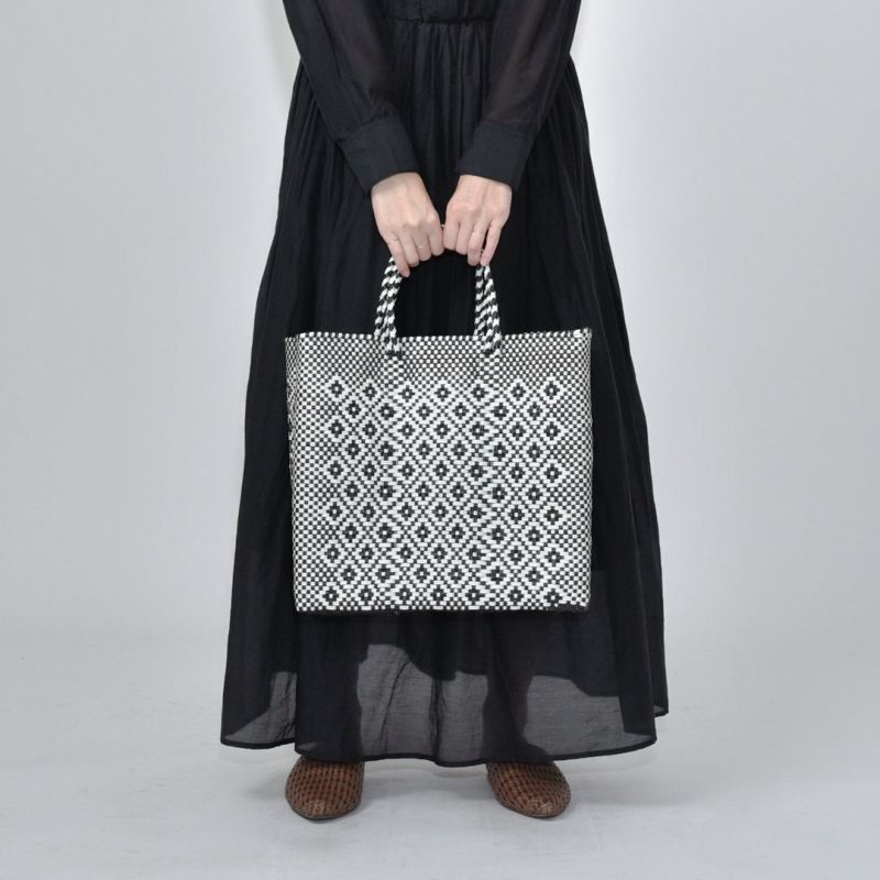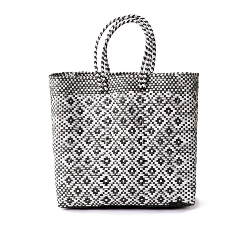 商品名:メルカドバッグ ロンボ カラー:ホワイト/ブラック サイズ:ミディアム(M)  縦:約31cm / 横:約33cm / マチ:13cm 原産国:Made in Mexico 素材 :プラスチック製※ハンドメイド品のためサイズには個体差があり、表記サイズは目安となります。予めご了承下さい。