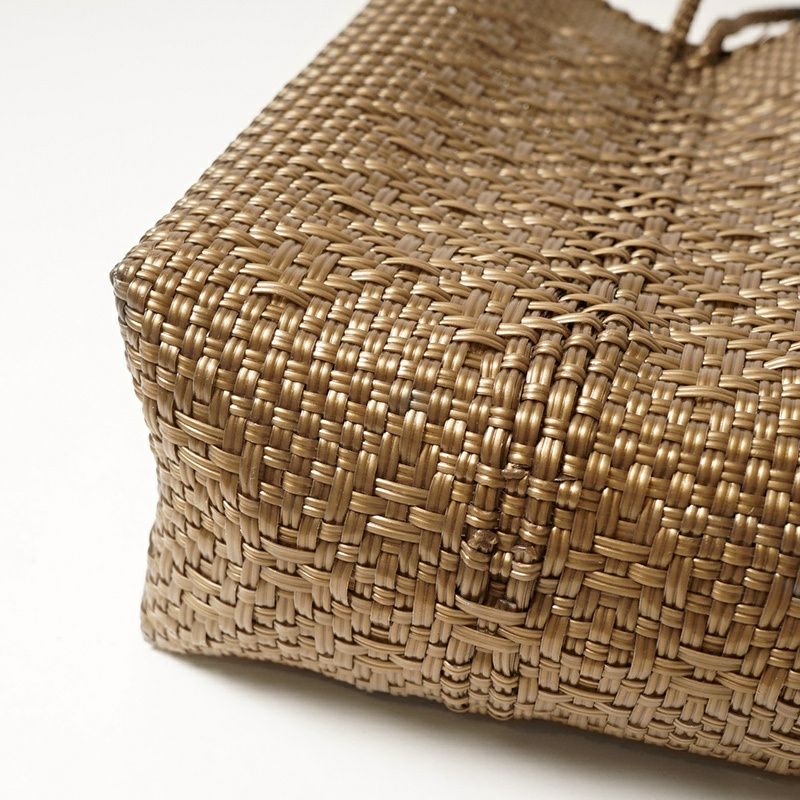 ハンドルはバッグ本体に編み込む形でバッグの底までぐるりと一周されていて、これにより重たい荷物にも耐えられるように強度がございます。