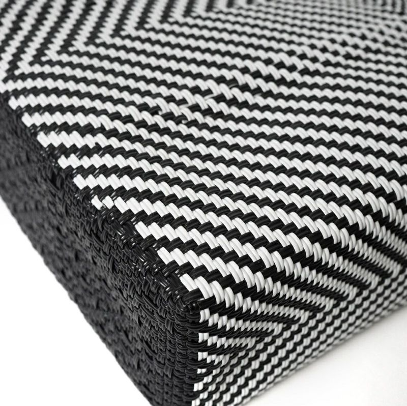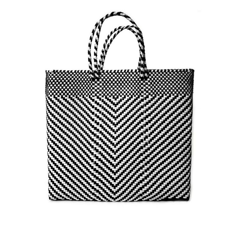 商品名:メルカドバッグ エスピガ カラー:ホワイト/ブラック サイズ:ミディアム(M)  縦:約31cm / 横:約33cm / マチ:13cm 原産国:Made in Mexico 素材 :プラスチック製※ハンドメイド品のためサイズには個体差があり、表記サイズは目安となります。予めご了承下さい。