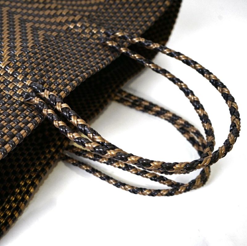 本体からハンドル部分にいたるまで紐がしっかりと編み込まれており、とても丈夫に作られているバッグは、水に濡れても平気な素材でできているため、水洗いも可能です。