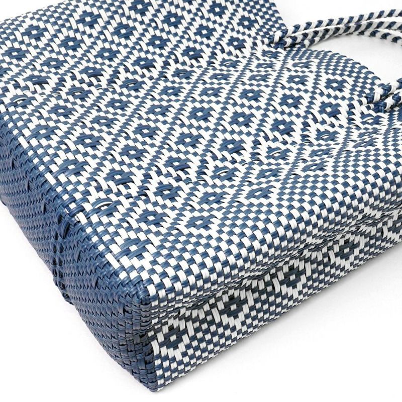 商品名:メルカドバッグ ロンボ カラー:ホワイト/メタリックブルー サイズ:ミディアム(M)  縦:約31cm / 横:約33cm / マチ:13cm 原産国:Made in Mexico 素材 :プラスチック製※ハンドメイド品のためサイズには個体差があり、表記サイズは目安となります。予めご了承下さい。