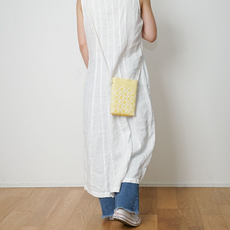メルカドバッグのコードで編んだポーチにはシンプルショルダーを付けました。カジュアルに楽しめるバッグになっています。