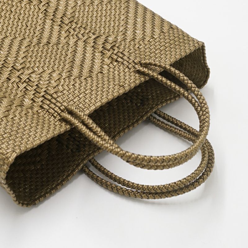 本体からハンドル部分にいたるまで紐がしっかりと編み込まれており、とても丈夫に作られているバッグは、水に濡れても平気な素材でできているため、水洗いも可能です。