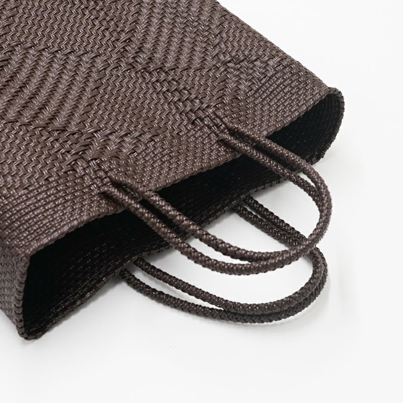 本体からハンドル部分にいたるまで紐がしっかりと編み込まれており、とても丈夫に作られているバッグは、水に濡れても平気な素材でできているため、水洗いも可能です。