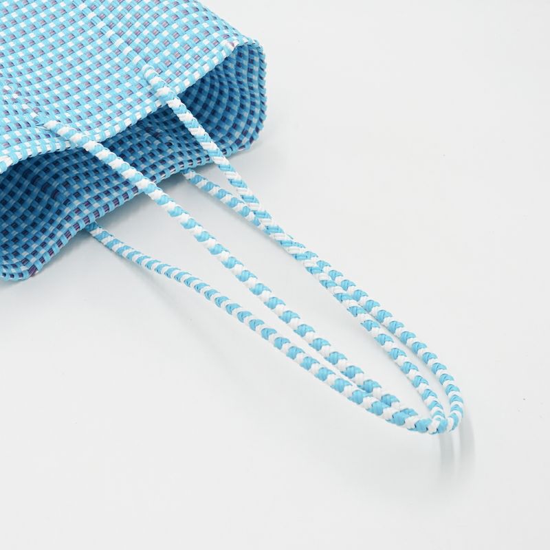 本体からハンドル部分にいたるまで紐がしっかりと編み込まれており、とても丈夫に作られているバッグは、水に濡れても平気な素材でできているため、水洗いも可能です。