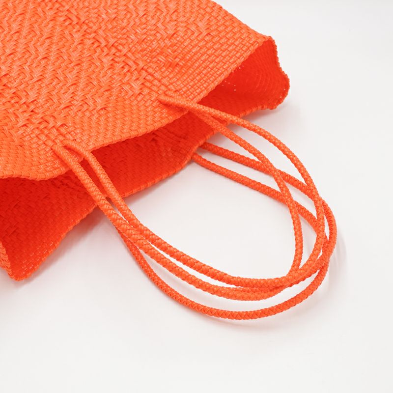 本体からハンドル部分にいたるまで紐がしっかりと編み込まれており、とても丈夫に作られているバッグは、水に濡れても平気な素材でできているため、水洗いも可能です。