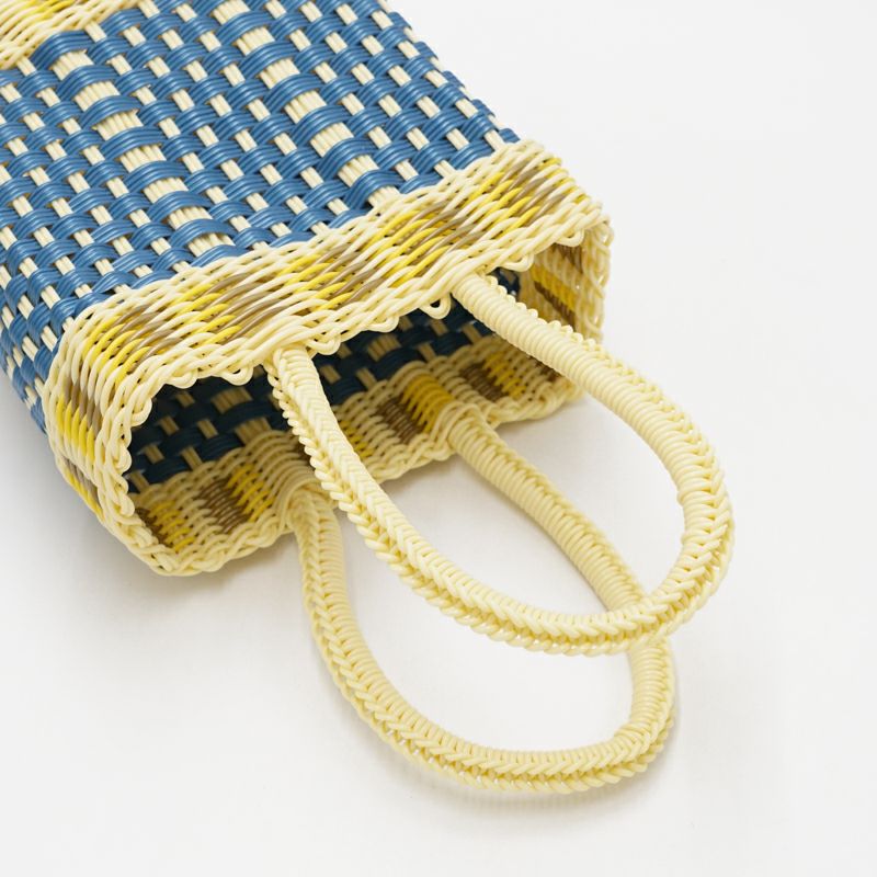 本体からハンドル部分にいたるまで紐がしっかりと編み込まれており、とても丈夫に作られているバッグは、水に濡れても平気な素材でできているため、水洗いも可能です。