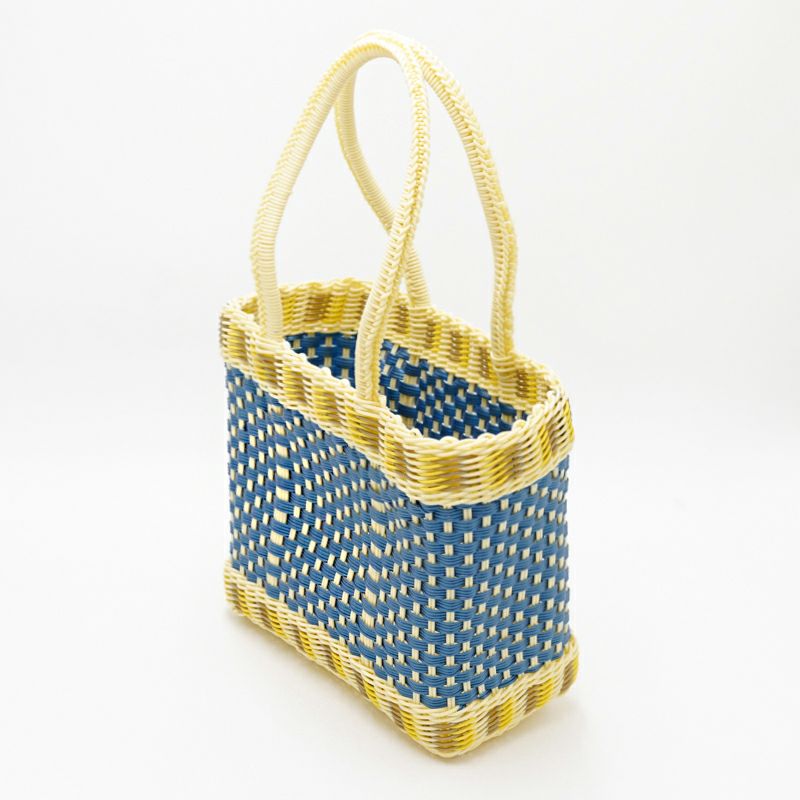 本体からハンドル部分にいたるまで紐がしっかりと編み込まれており、とても丈夫に作られているバッグは、水に濡れても平気な素材でできているため、水洗いも可能です。