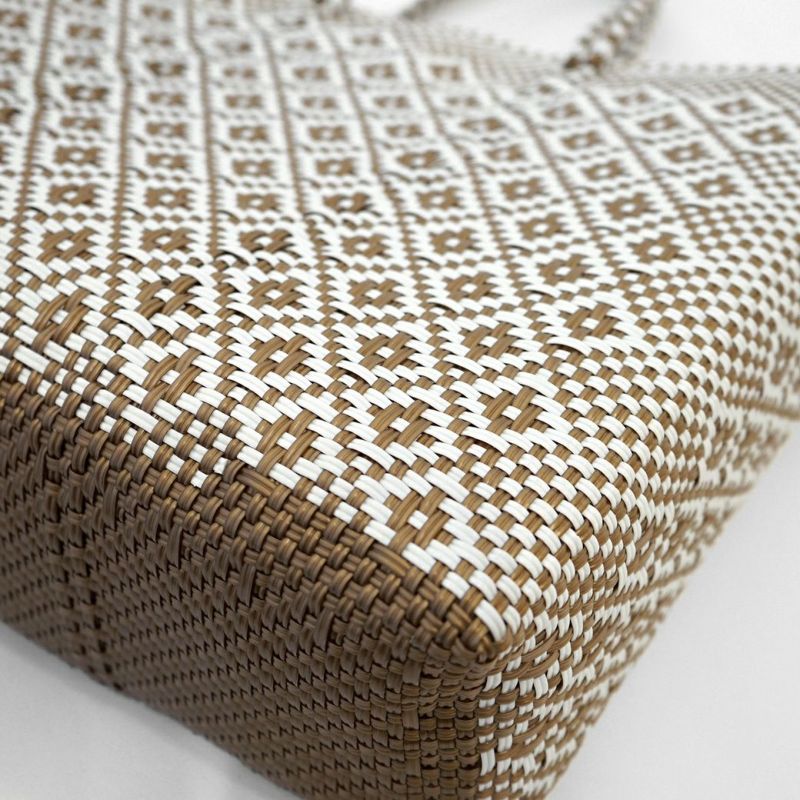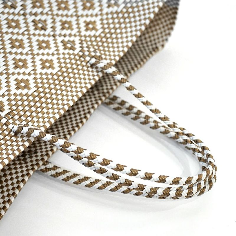 本体からハンドル部分にいたるまで紐がしっかりと編み込まれており、とても丈夫に作られているバッグは、水に濡れても平気な素材でできているため、水洗いも可能です。