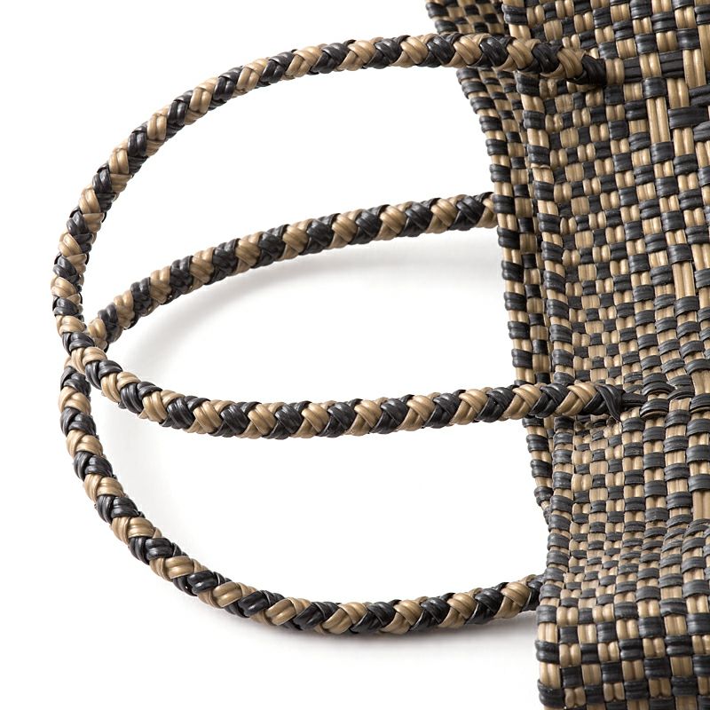 本体からハンドル部分にいたるまで紐がしっかりと編み込まれており、とても丈夫に作られているバッグは、水に濡れても平気な素材でできているため、水洗いも可能です。