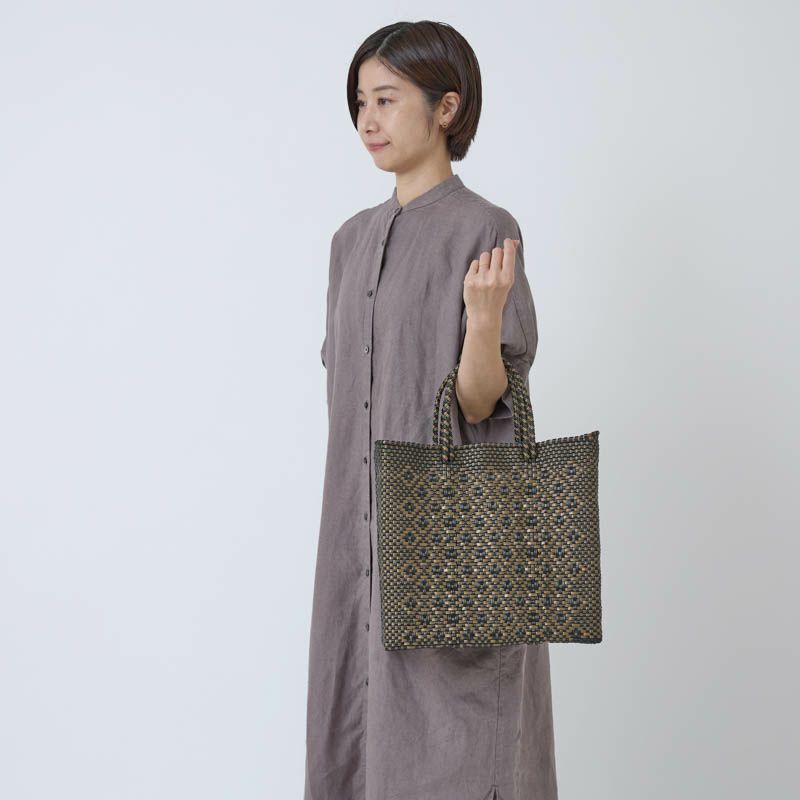 商品名:メルカドバッグ ロンボ カラー:ゴールド/ブラック サイズ:ミディアム(M)  縦:約31cm / 横:約33cm / マチ:13cm 原産国:Made in Mexico 素材 :プラスチック製※ハンドメイド品のためサイズには個体差があり、表記サイズは目安となります。予めご了承下さい。