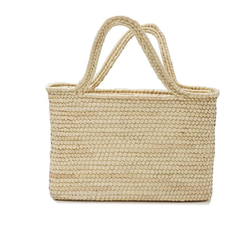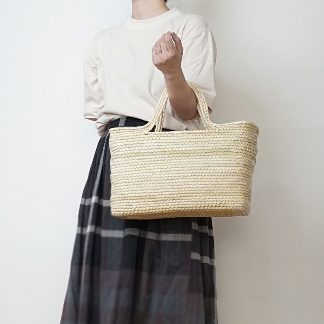 職人の手によりヤシの葉を編み込んで作られたカゴバッグです。染色を行なっていないナチュラルな色合いは初夏〜夏の装いにぴったり。天然素材のため、経年変化を楽しむことができます。