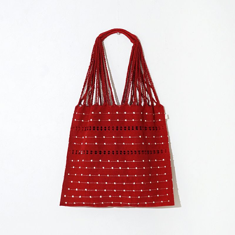 肩ひも部分は、バッグを織っていた糸を縒って作られており、糸処理の結び目が飛び出して見える場合がございます。