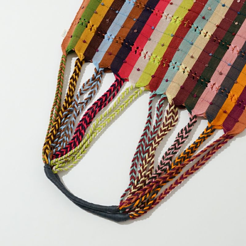 肩ひも部分は、バッグを織っていた糸を縒って作られており、糸処理の結び目が飛び出して見える場合がございます。