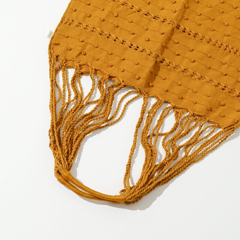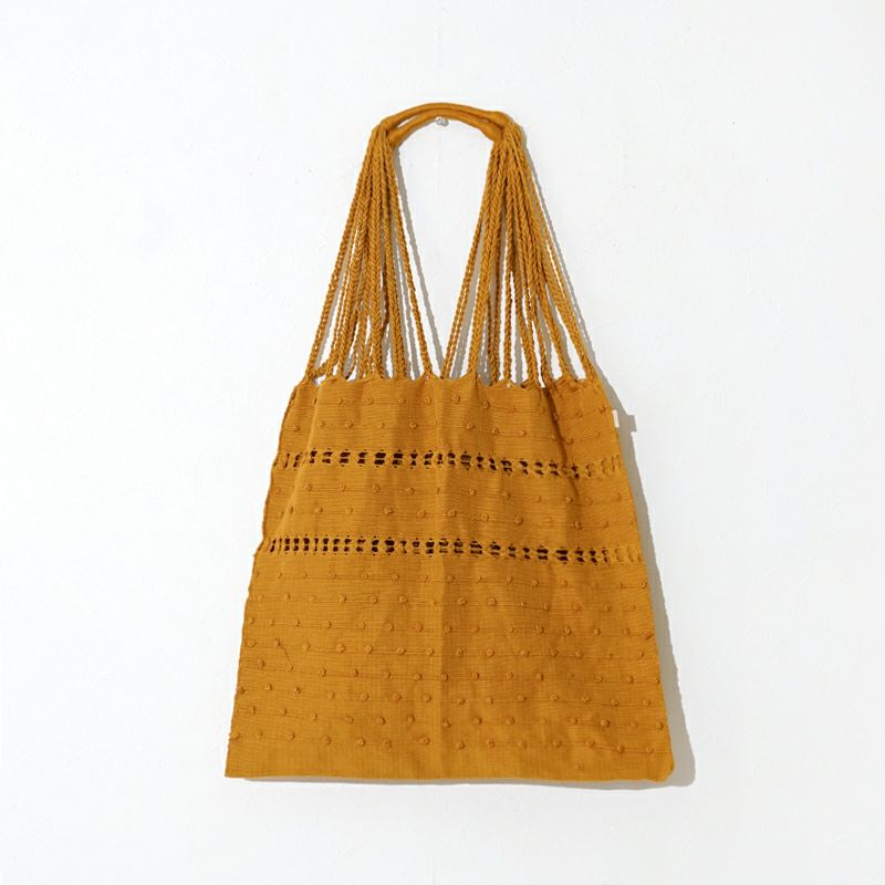 肩ひも部分は、バッグを織っていた糸を縒って作られており、糸処理の結び目が飛び出して見える場合がございます。