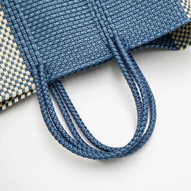 本体からハンドル部分にいたるまで紐がしっかりと編み込まれており、とても丈夫に作られているバッグは、水に濡れても平気な素材でできているため、水洗いも可能です。