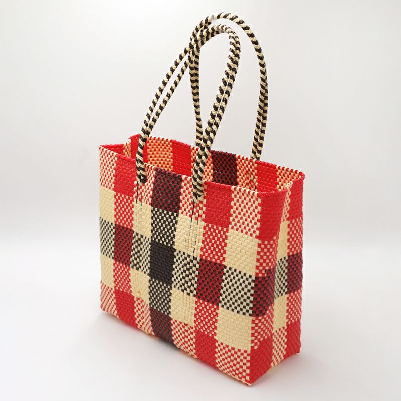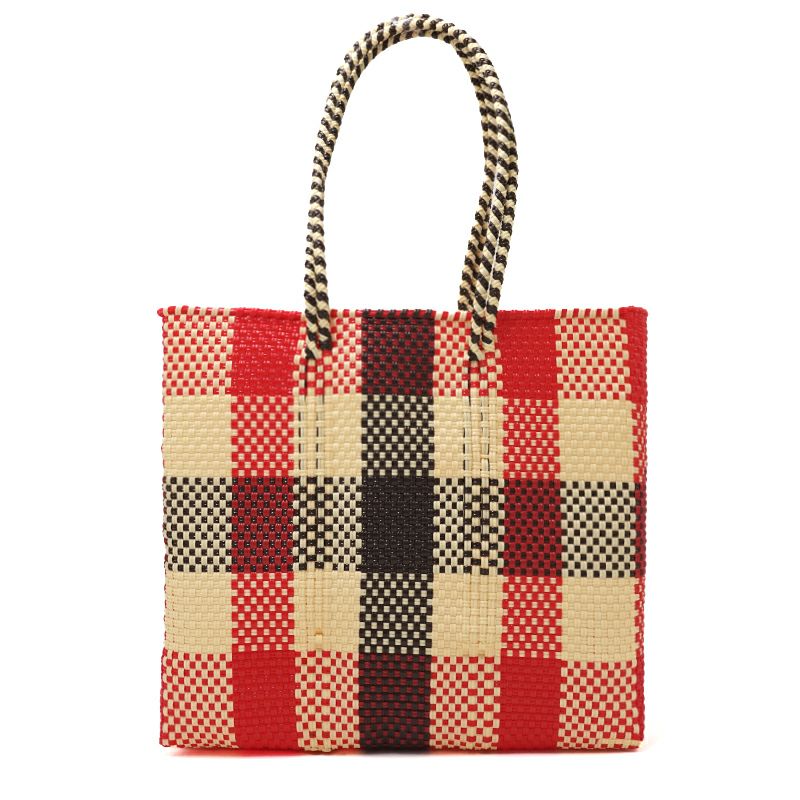 MERCADO BAG - 3COLORS CHECK - LONG HANDLE - Cream / Red / Brown (M)