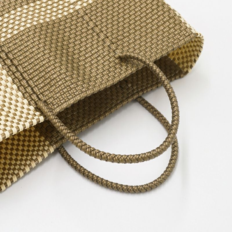 本体からハンドル部分にいたるまで紐がしっかりと編み込まれており、とても丈夫に作られているバッグは、水に濡れても平気な素材でできているため、水洗いも可能です。