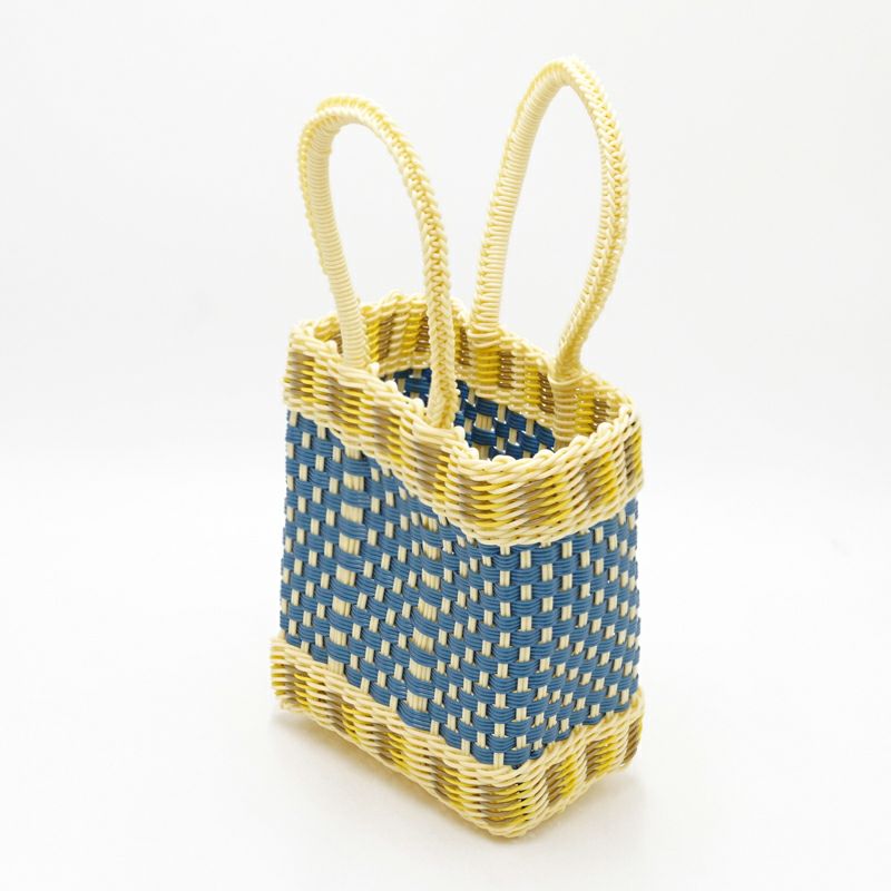 本体からハンドル部分にいたるまで紐がしっかりと編み込まれており、とても丈夫に作られているバッグは、水に濡れても平気な素材でできているため、水洗いも可能です。