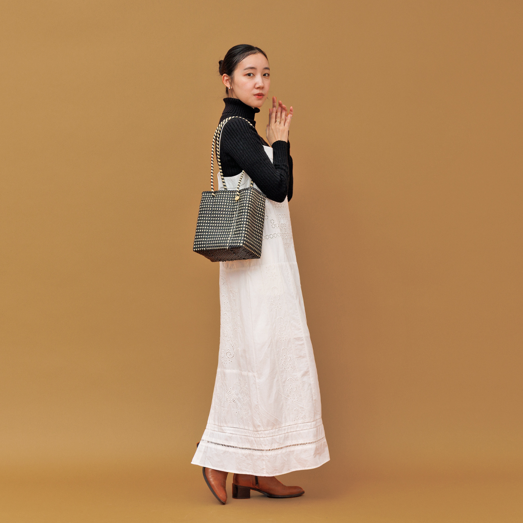 横長のシルエットは、ワンピースやブラウスなどきちんと服との相性がばっちりで、品よくおしゃれを楽しめます。。