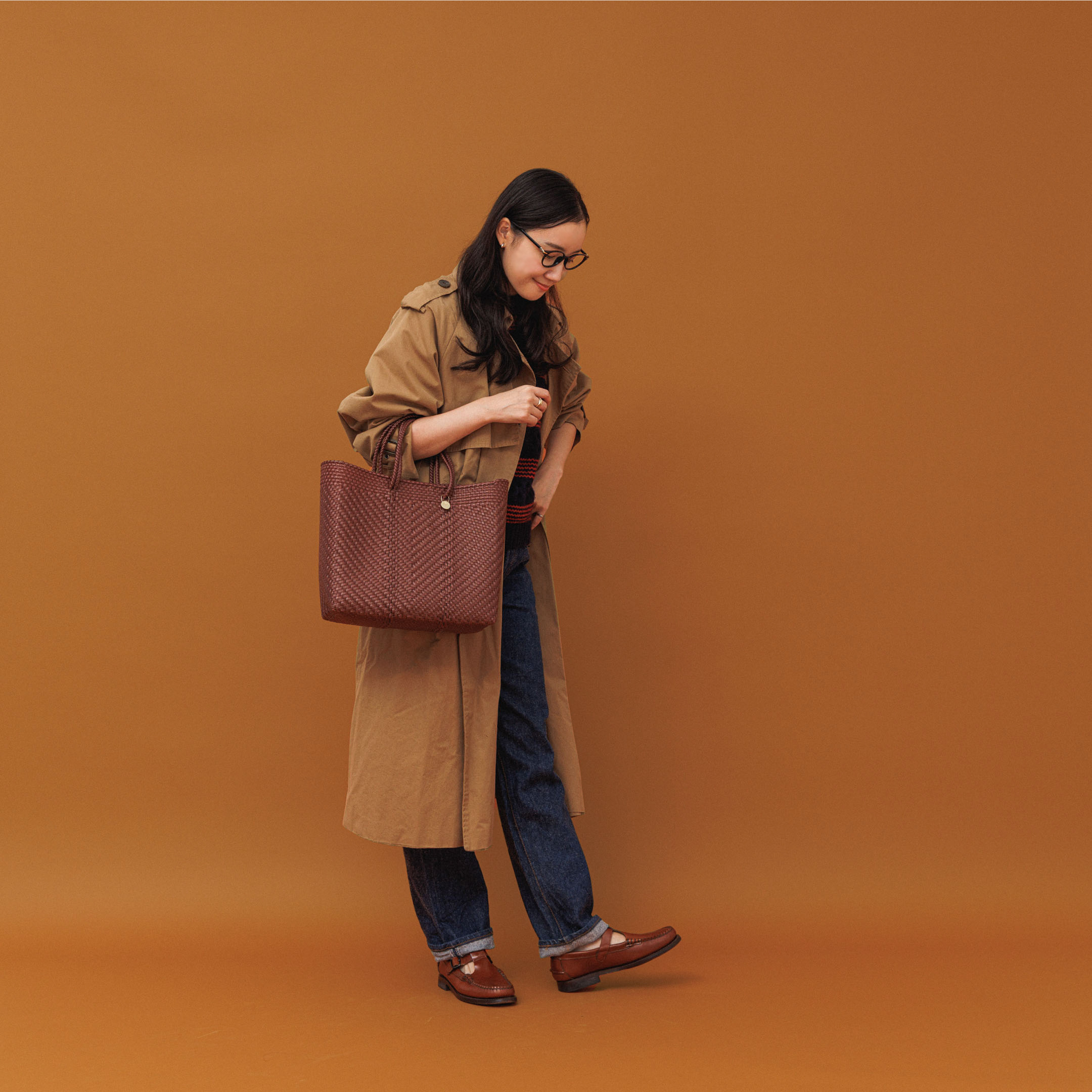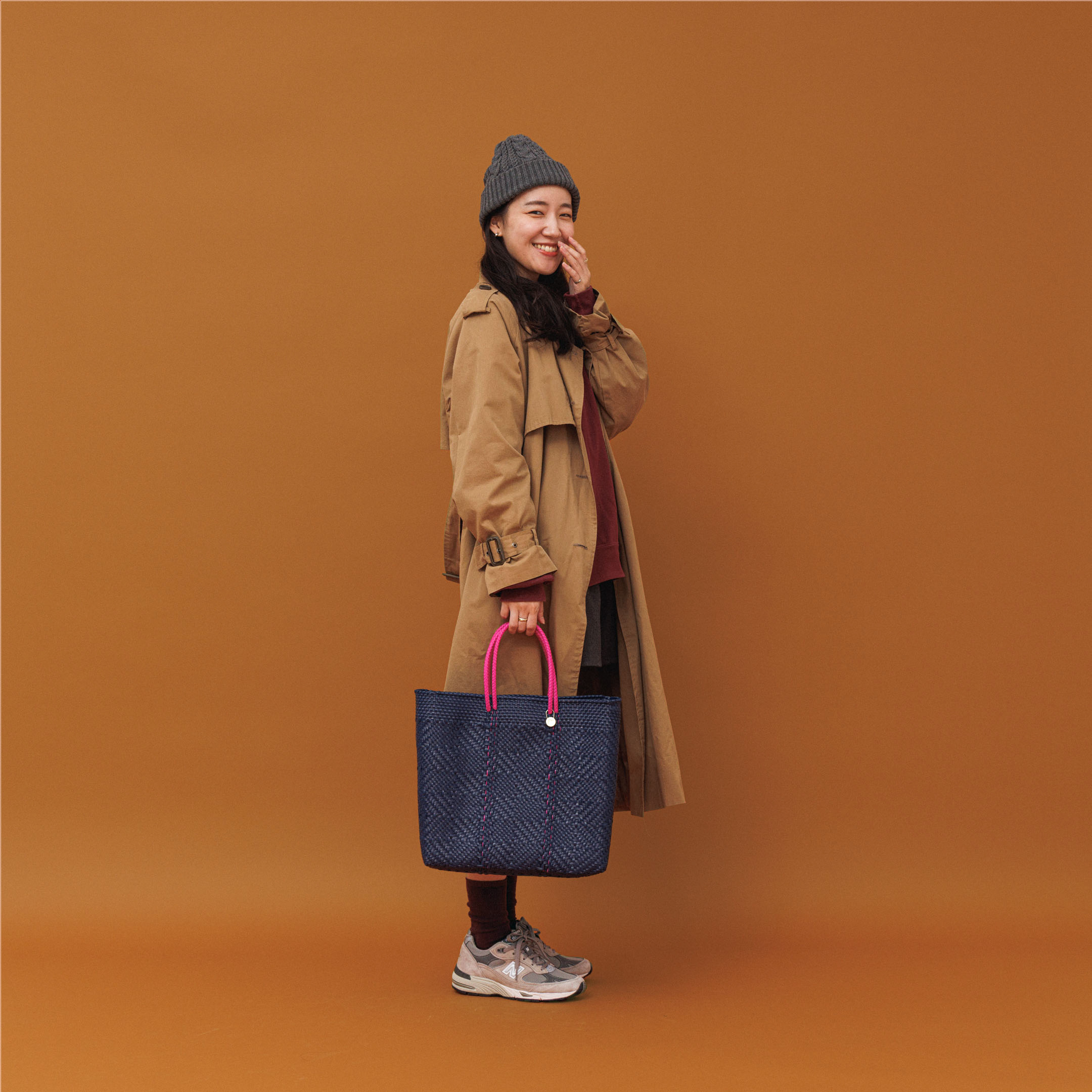 秋冬に大活躍のトレンチコートやデニムジャケット、キルティングジャケットなどのカジュアルなアウターはカラフルなメルカドバッグが映えるためスタッフの間でも着こなしの定番です。