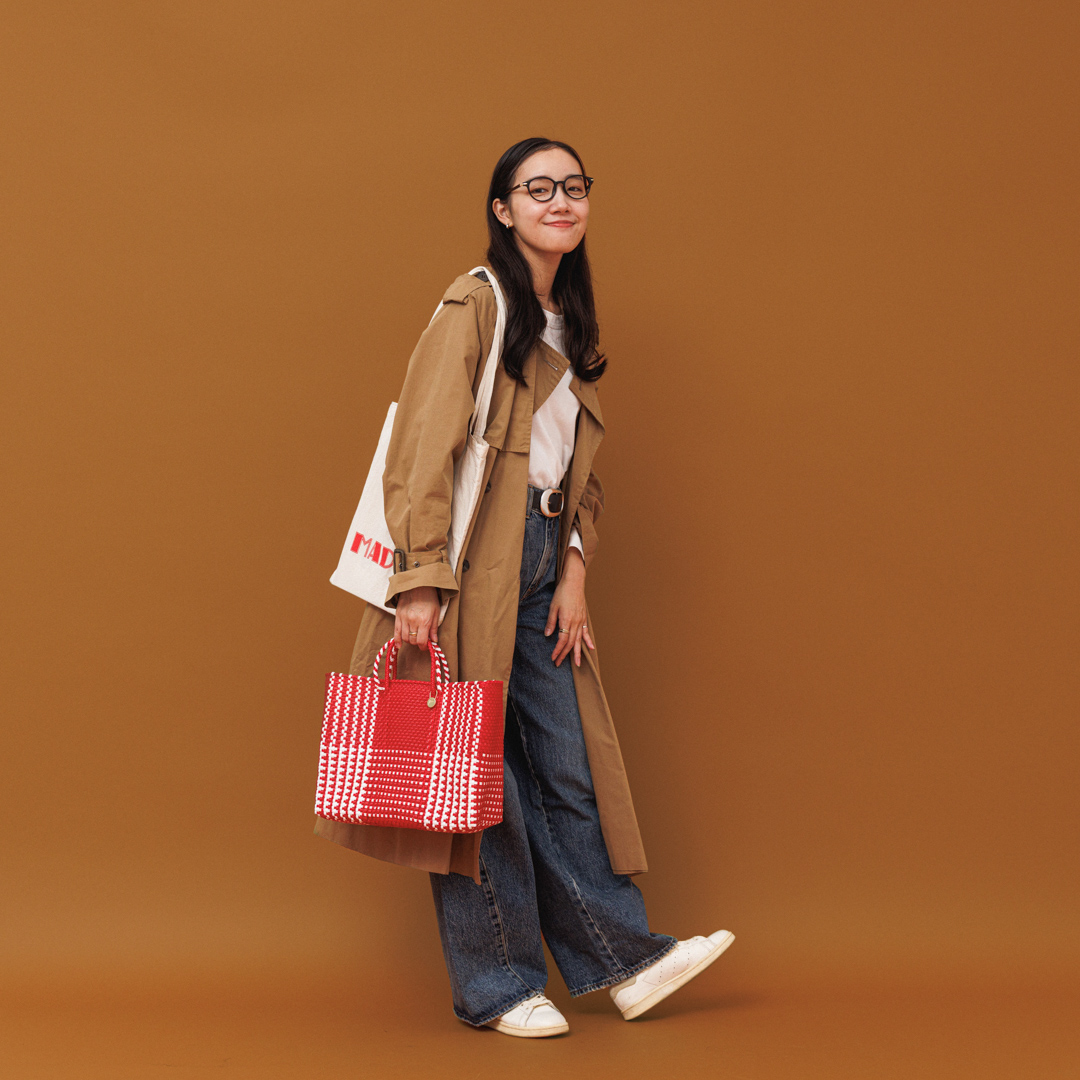 ラフなコートと合わせても、かごバッグが上品さを醸し出しています。